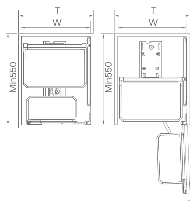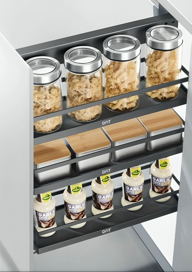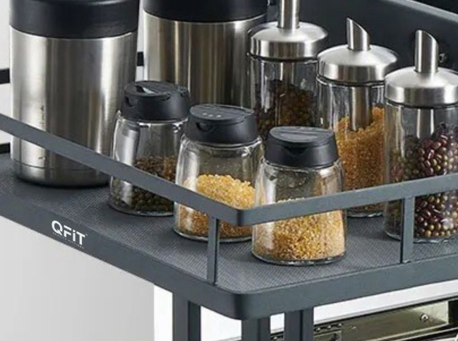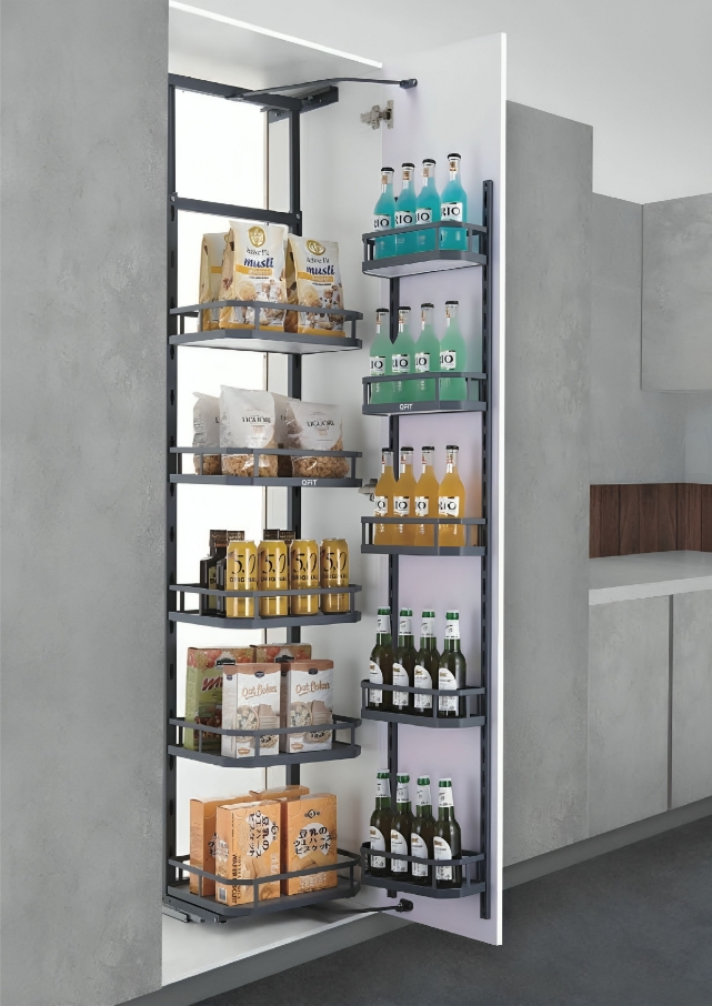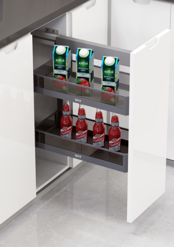 Function - Organize kitchen products as desired with our premium bottle pullout system. Bottle pullout used for modular kitchen cabinet equipped with soft close Quadro channels.