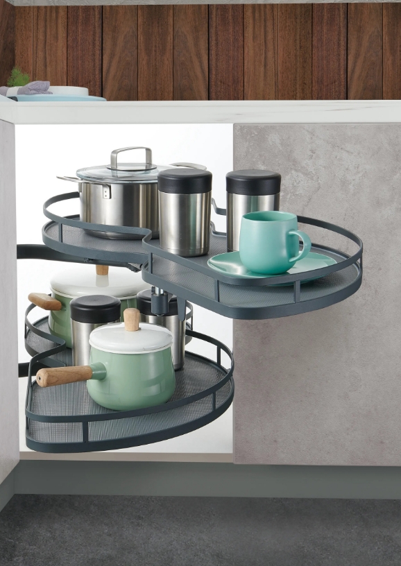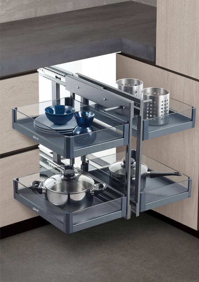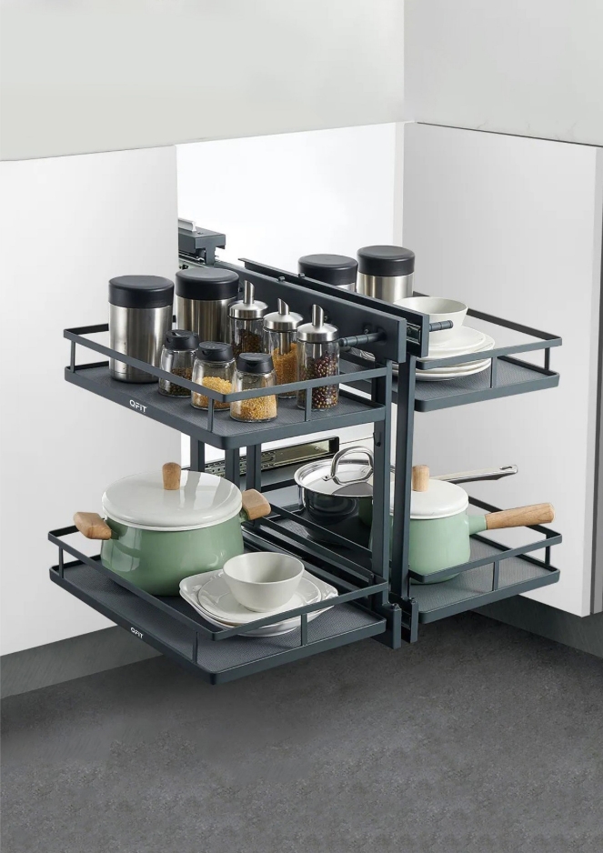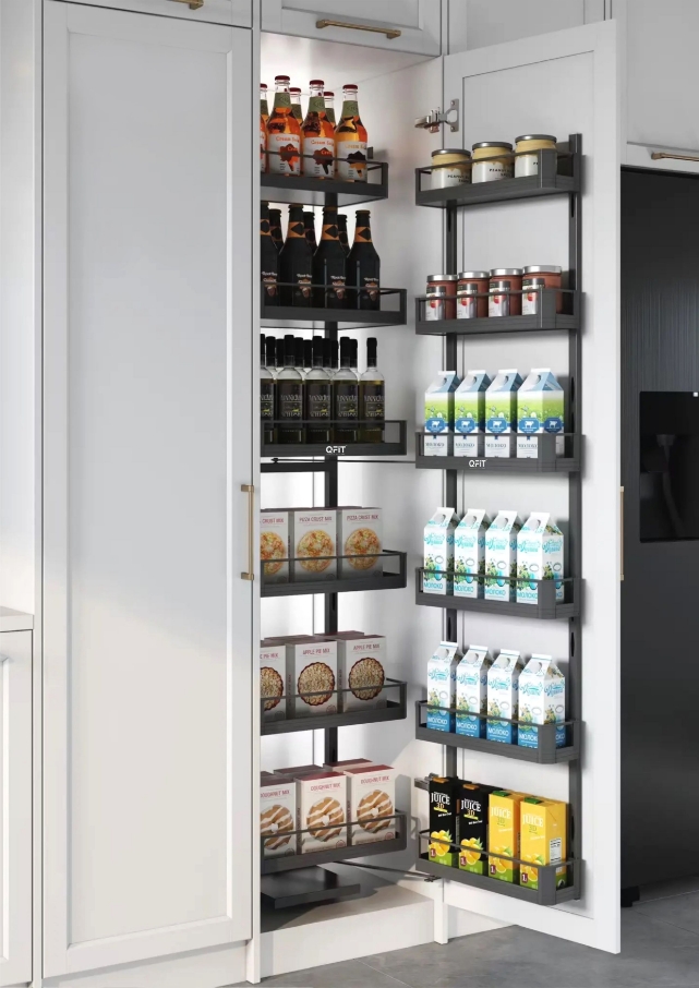 Function Make full use of corner space with interlock pantry design to pull all baskets out from the cabinet obtaining great convenience in storage of infrequently used such as small household appliances, plates & bowls, dried fruits or spices.